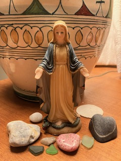 Jennifer: I was seeing.. I’ll show you my little Mother [statue], here she is. I got her in the Dominican Republic, just love its purity and sweetness, kindness and warmth. She is very young here, but I love the gesture of the open palms…